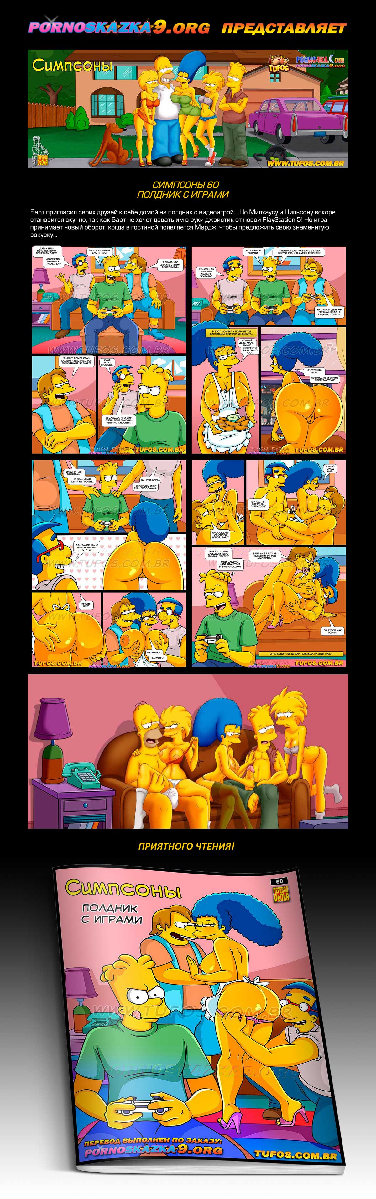 Порно комикс «Симпсоны. Часть 60. Полдник с играми». Барт пригласил своих друзей к себе домой на полдник с видеоигрой… Но Милхаусу и Нильсону вскоре становится скучно, так как Барт не хочет давать им в руки джойстик от новой PlayStation 5! Но игра принимает новый оборот, когда в гостиной появляется Мардж, чтобы предложить свою знаменитую закуску…